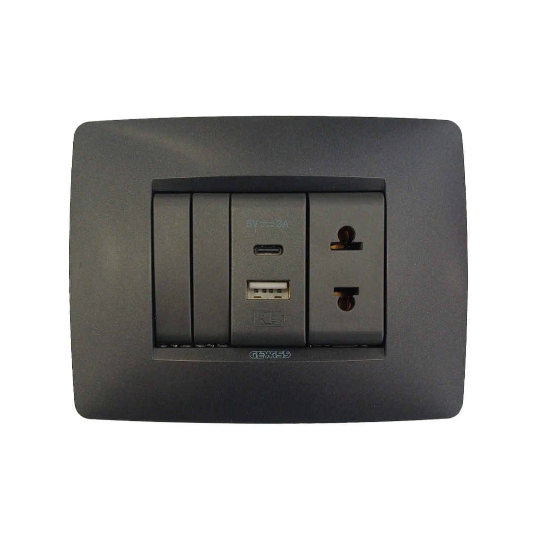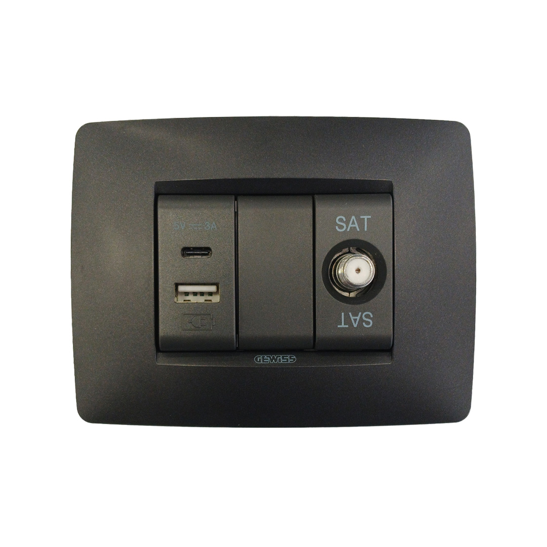 Gewiss GW12449 USB&type C + GW12195 boşluq qapaq + GW12371 tv elektrik yuvası mat qara rəng