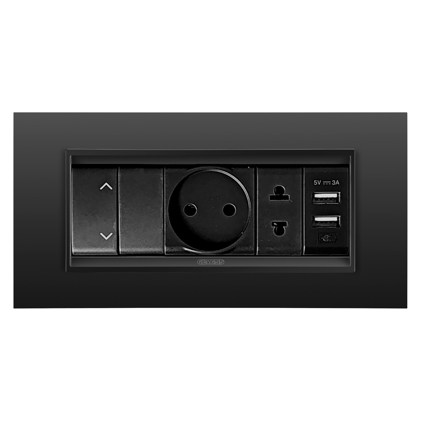 Gewiss GW12140 Jaluz elektrik açarı qara, GW12051 vavien qara, GW12246 2M elektrik yuvası, GW12287 1M elektrik yuvası, GW12447 USB elektrik yuvası metal çərçivə monoxrom